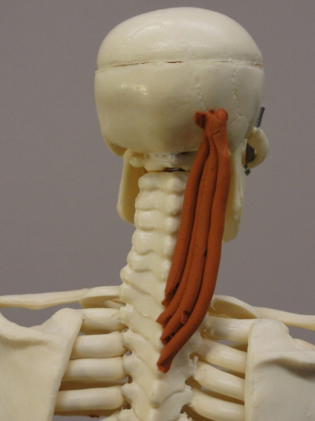 Action: acting bilaterally: neck extension and hyperextension; acting unilaterally: head abduction and cervical spine rotation (as in cocking head)